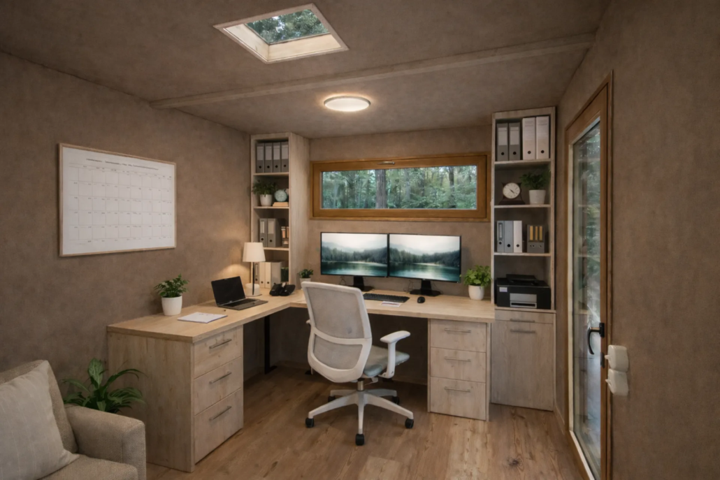 Mit integriertem Schreibtisch, Stauraum, Küchelement und moderner Ausstattung entsteht ein sofort nutzbares Büro direkt auf Ihrem Grundstück.