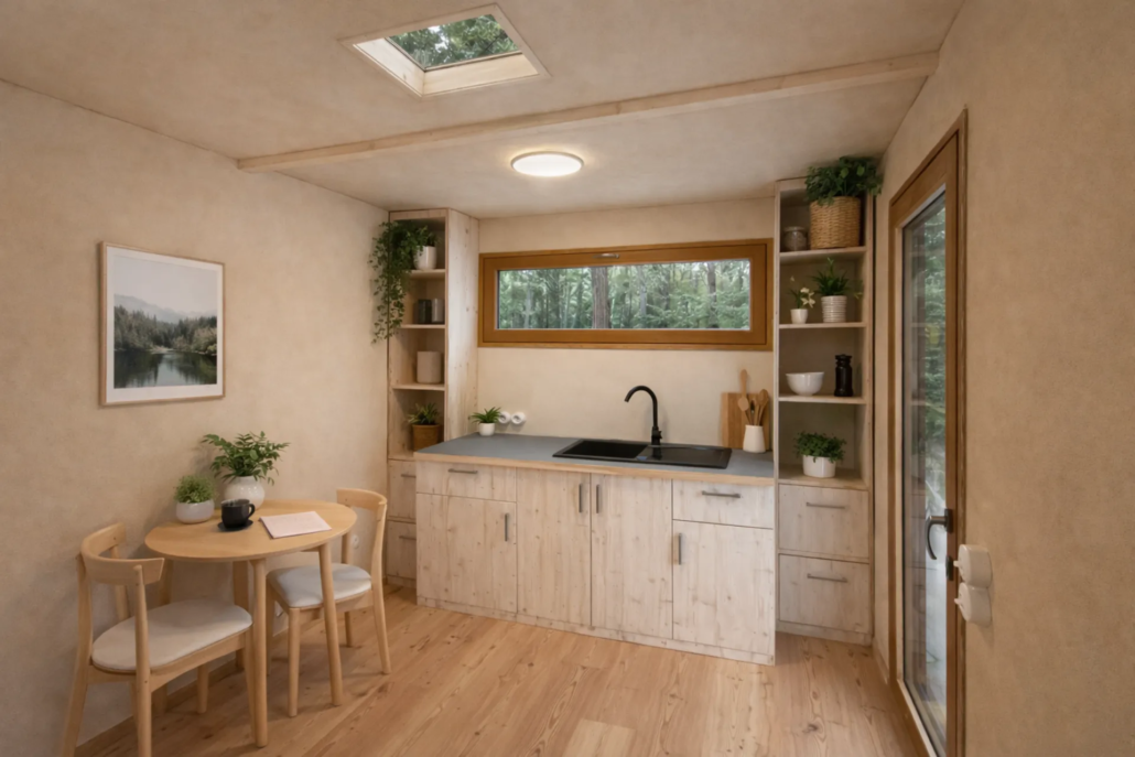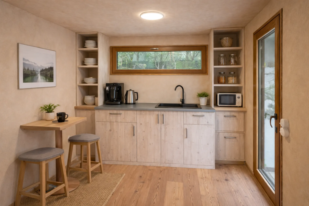 Die integrierte Küchenzeile im Modell Office verbindet funktionales Design mit nachhaltigen Materialien.